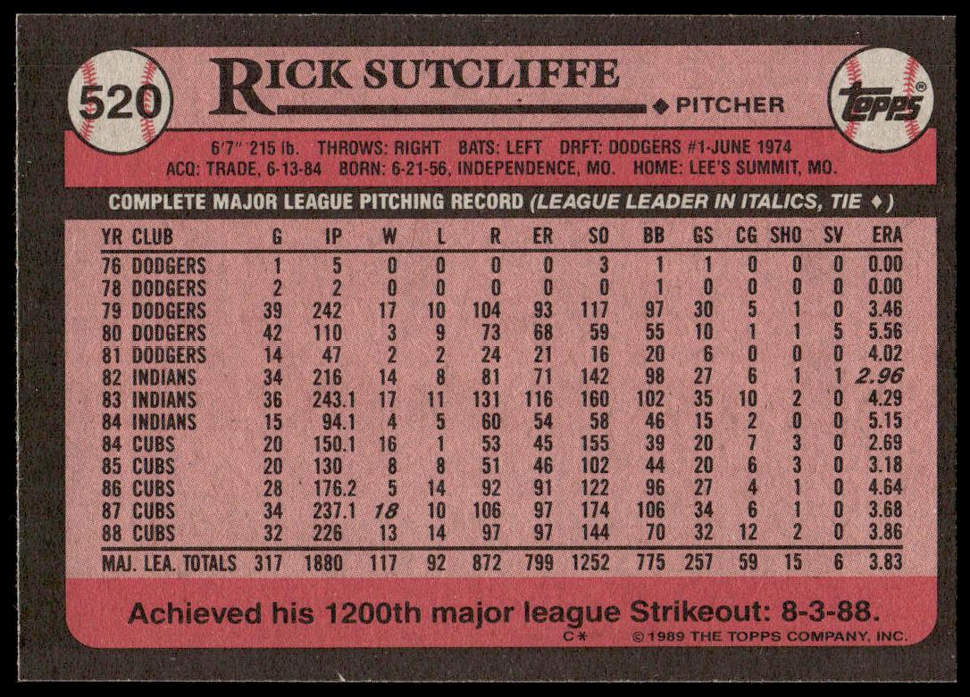 This Baseball card, from 1989 is part of the Topps  card set. Rick Sutcliffe is featured and has a card number of 520.