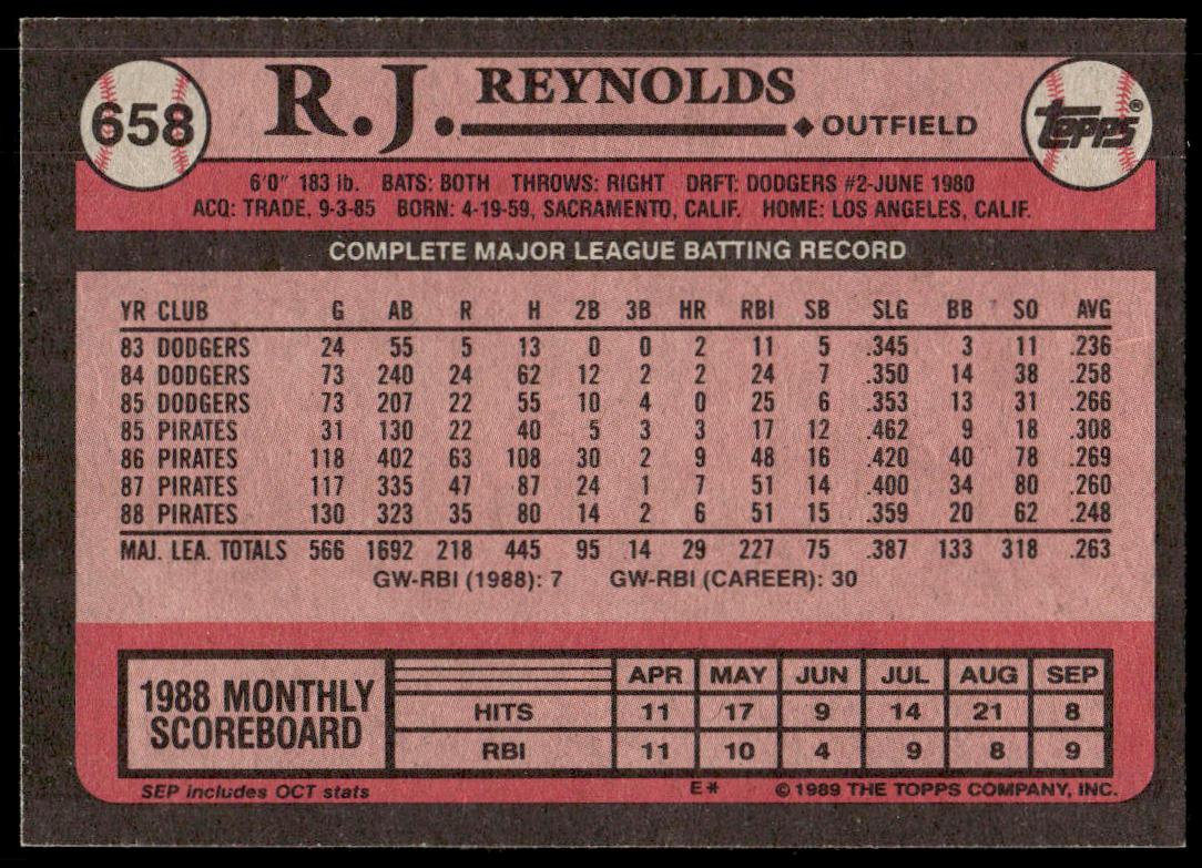 This Baseball card, from 1989 is part of the Topps  card set. R.J. Reynolds is featured and has a card number of 658.