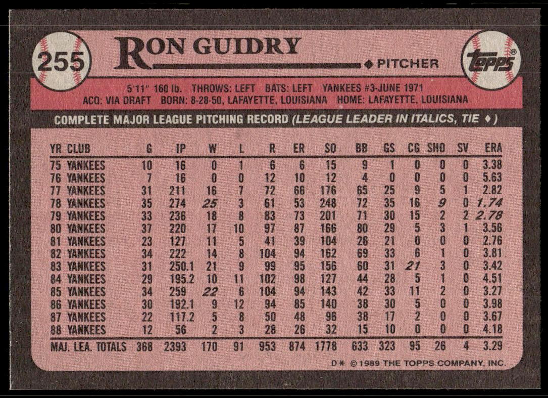 This Baseball card, from 1989 is part of the Topps  card set. Ron Guidry is featured and has a card number of 255.