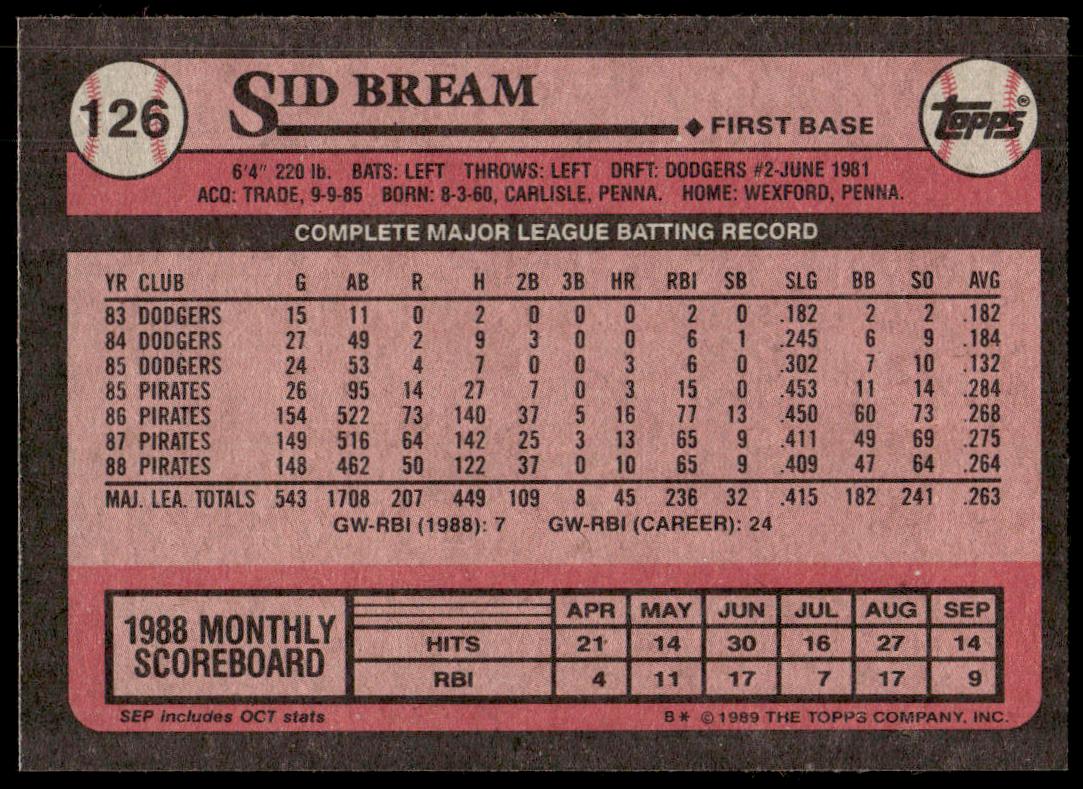 This Baseball card, from 1989 is part of the Topps  card set. Sid Bream is featured and has a card number of 126.