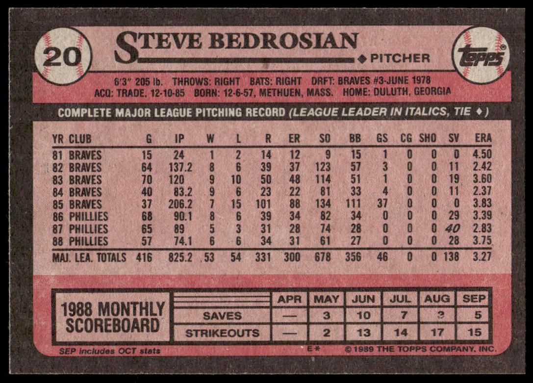 This Baseball card, from 1989 is part of the Topps  card set. Steve Bedrosian is featured and has a card number of 20.