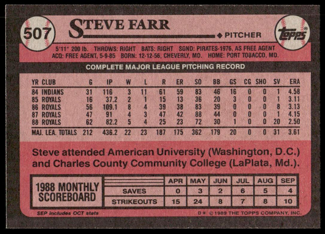 This Baseball card, from 1989 is part of the Topps  card set. Steve Farr is featured and has a card number of 507.