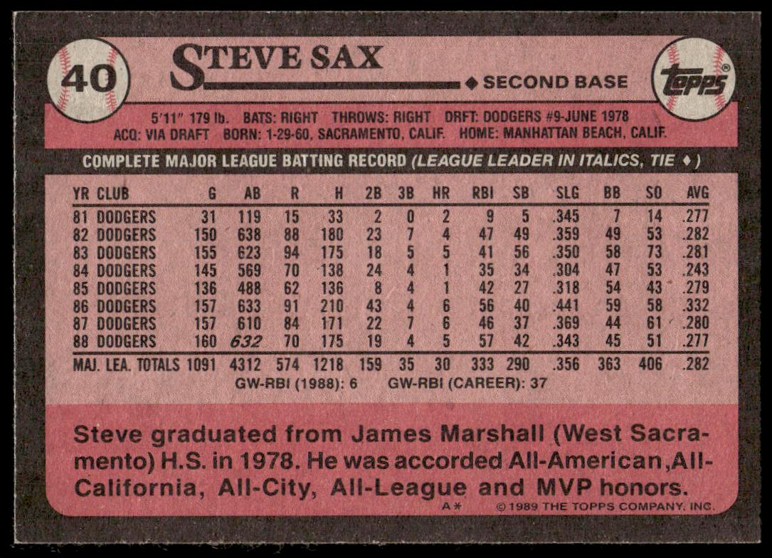 This Baseball card, from 1989 is part of the Topps  card set. Steve Sax is featured and has a card number of 40.