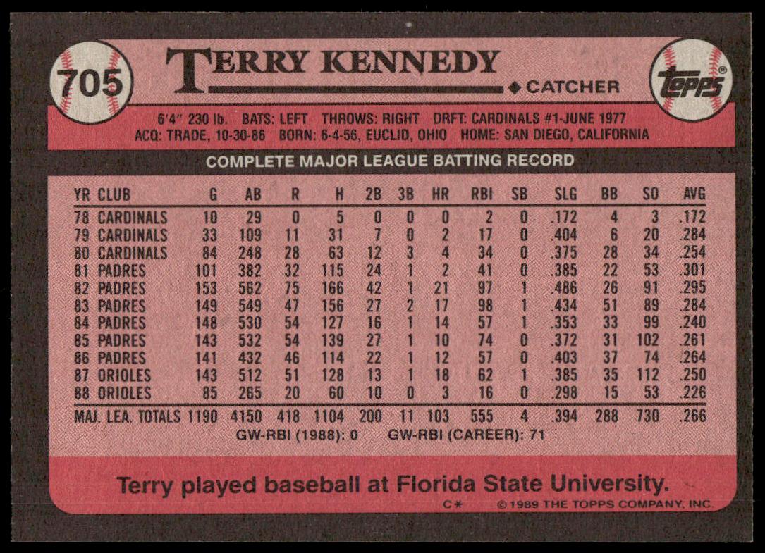 This Baseball card, from 1989 is part of the Topps  card set. Terry Kennedy is featured and has a card number of 705.