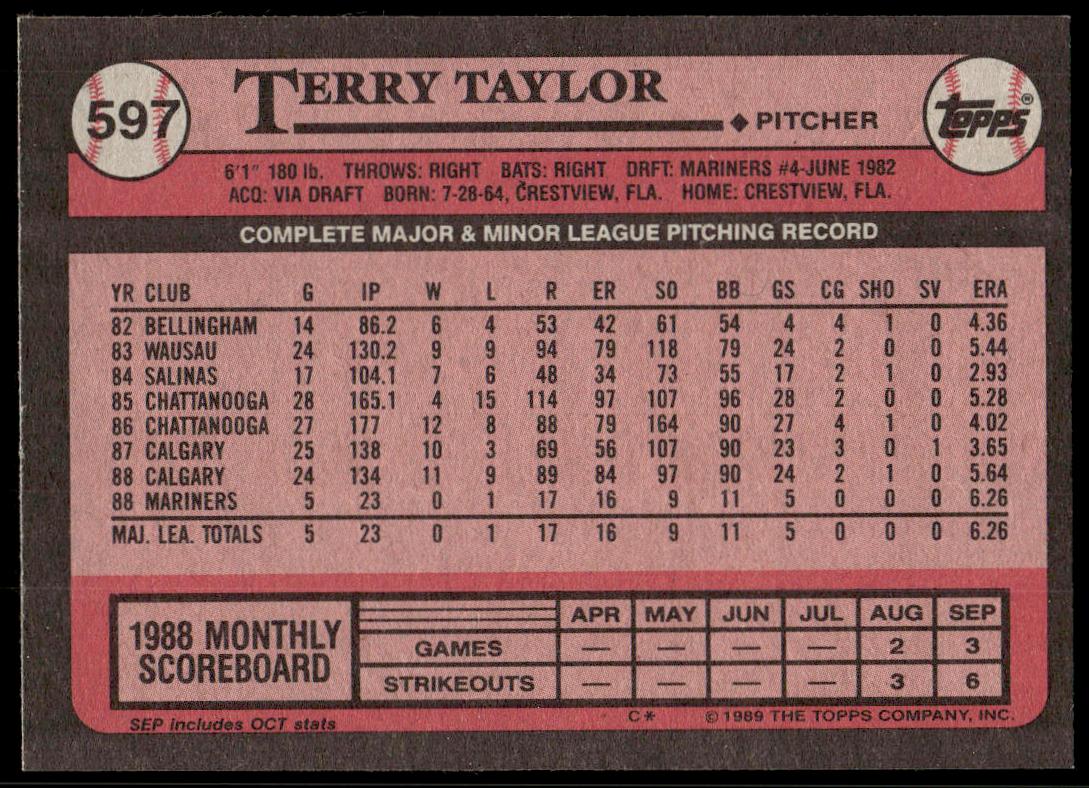 This Baseball card, from 1989 is part of the Topps  card set. Terry Taylor is featured and has a card number of 597.