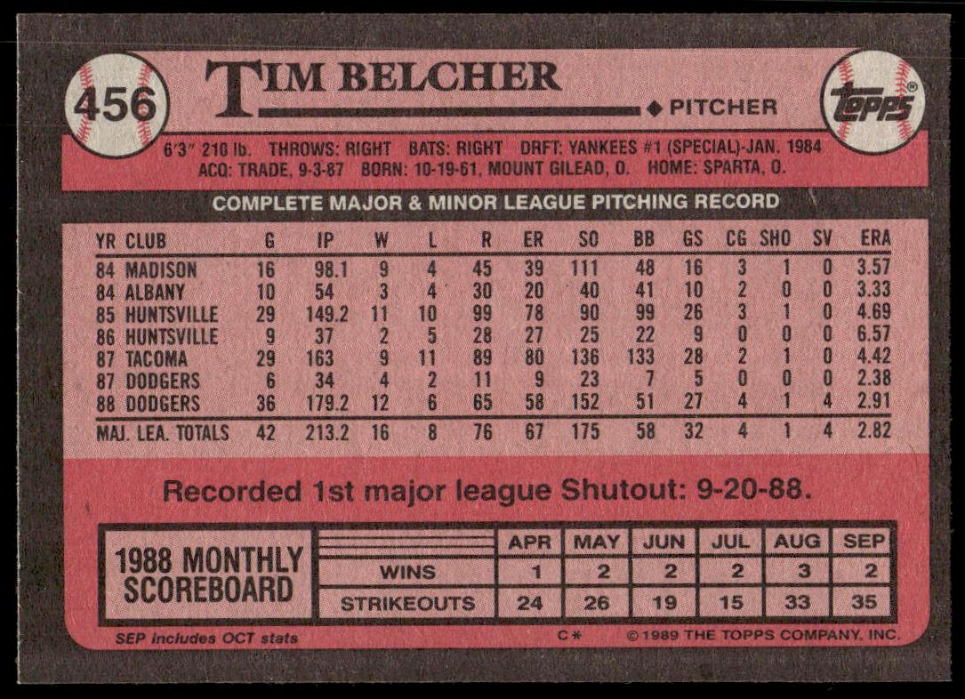 This Baseball card, from 1989 is part of the Topps  card set. Tim Belcher is featured and has a card number of 456.