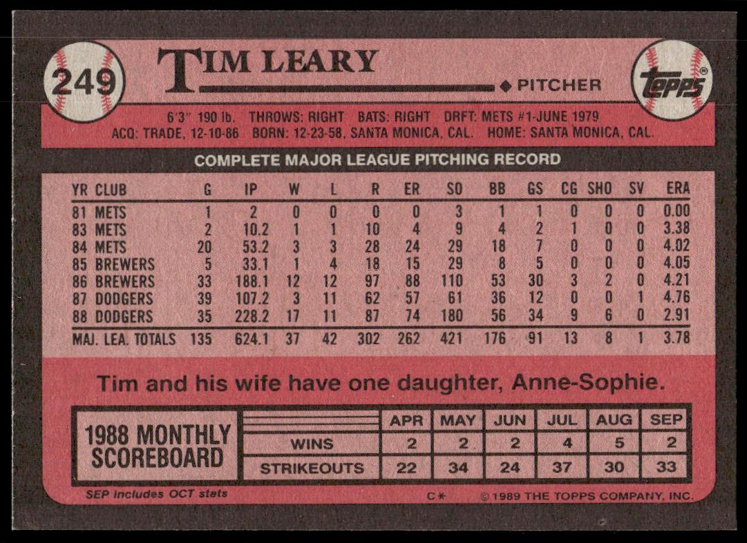 This Baseball card, from 1989 is part of the Topps  card set. Tim Leary is featured and has a card number of 249.
