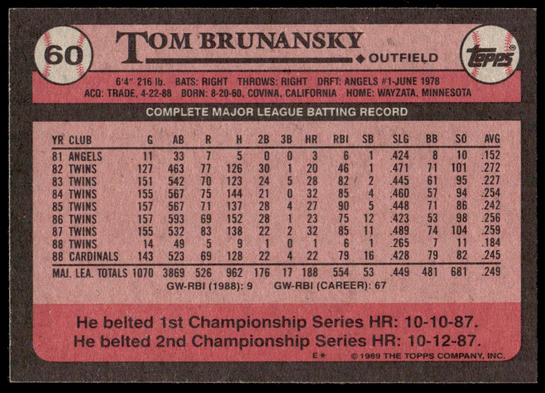 This Baseball card, from 1989 is part of the Topps  card set. Tom Brunansky is featured and has a card number of 60.