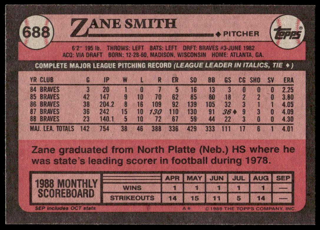 This Baseball card, from 1989 is part of the Topps  card set. Zane Smith is featured and has a card number of 688.