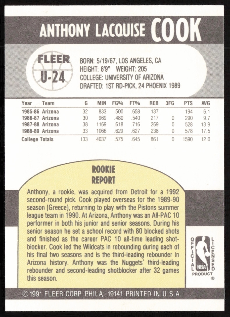 This Basketball card, from 1990-91 is part of the Fleer Update card set. Anthony Cook is featured and has a card number of U-24.