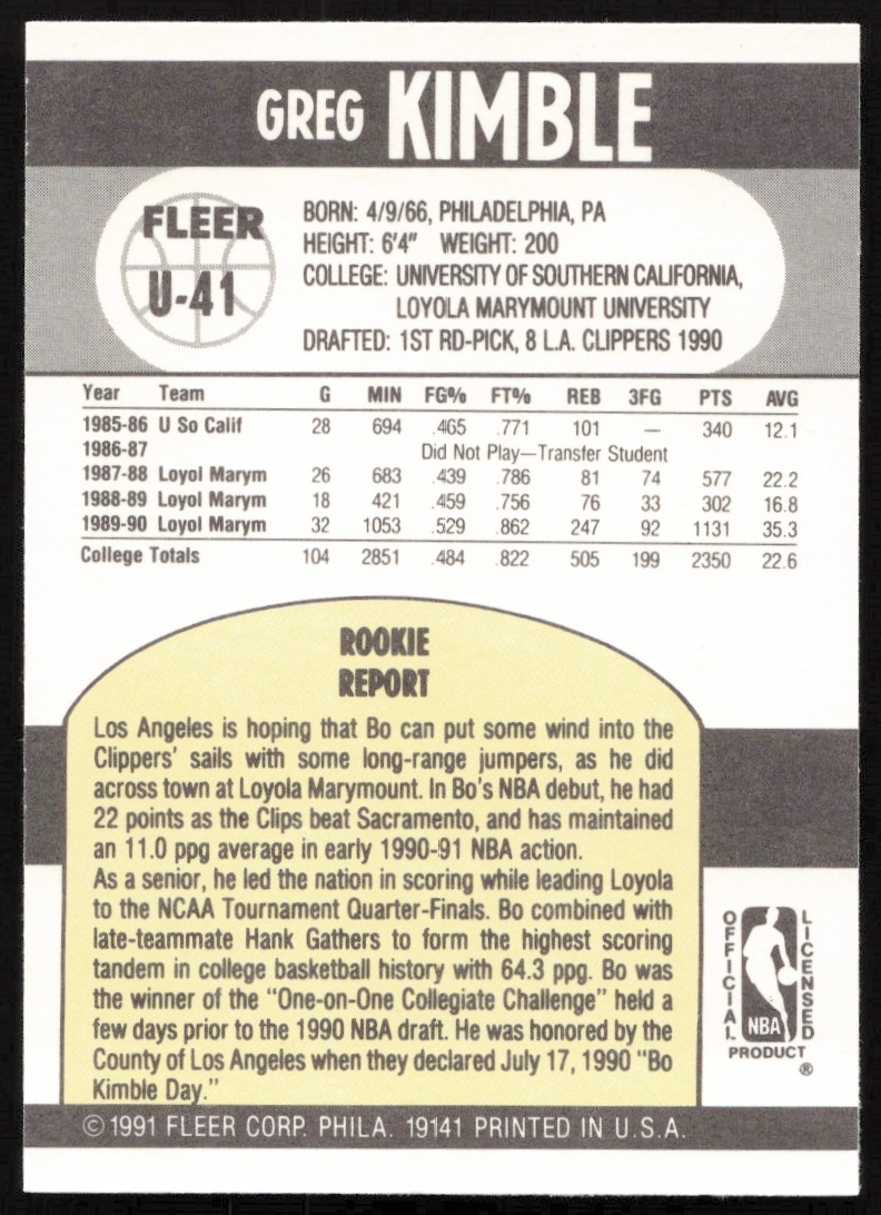 This Basketball card, from 1990-91 is part of the Fleer Update card set. Bo Kimble is featured and has a card number of U-41.