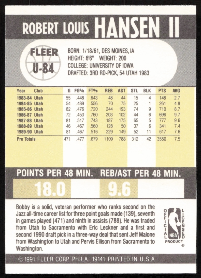 This Basketball card, from 1990-91 is part of the Fleer Update card set. Bobby Hansen is featured and has a card number of U-84.