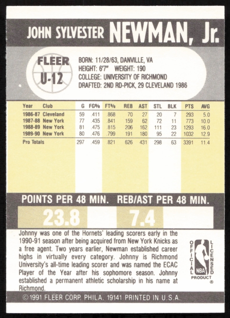 This Basketball card, from 1990-91 is part of the Fleer Update card set. Johnny Newman is featured and has a card number of U-12.