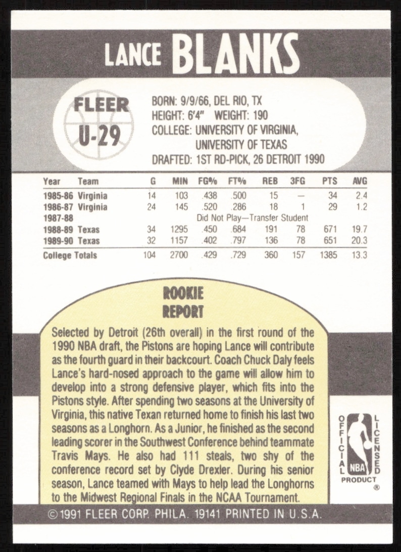 This Basketball card, from 1990-91 is part of the Fleer Update card set. Lance Blanks is featured and has a card number of U-29.