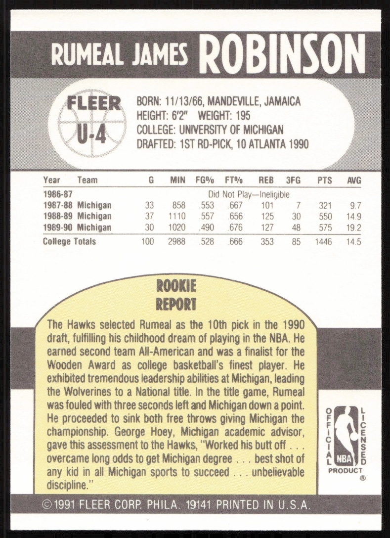 This Basketball card, from 1990-91 is part of the Fleer Update card set. Rumeal Robinson is featured and has a card number of U-4.