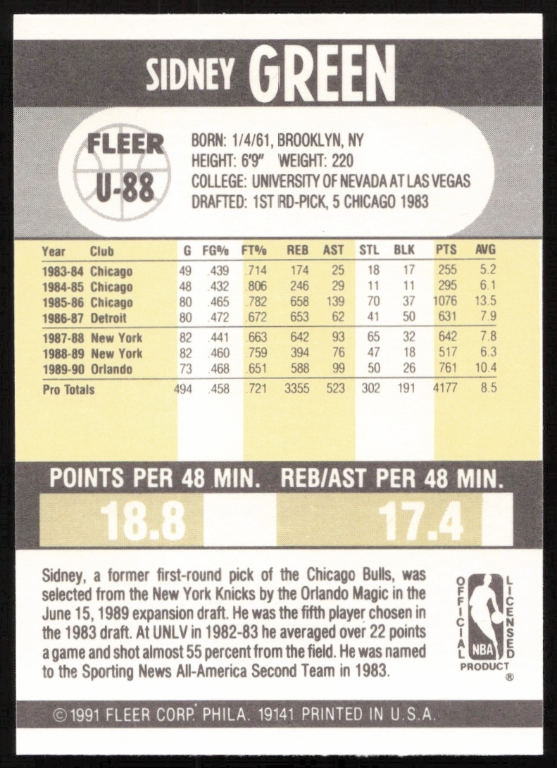 This Basketball card, from 1990-91 is part of the Fleer Update card set. Sidney Green is featured and has a card number of U-88.