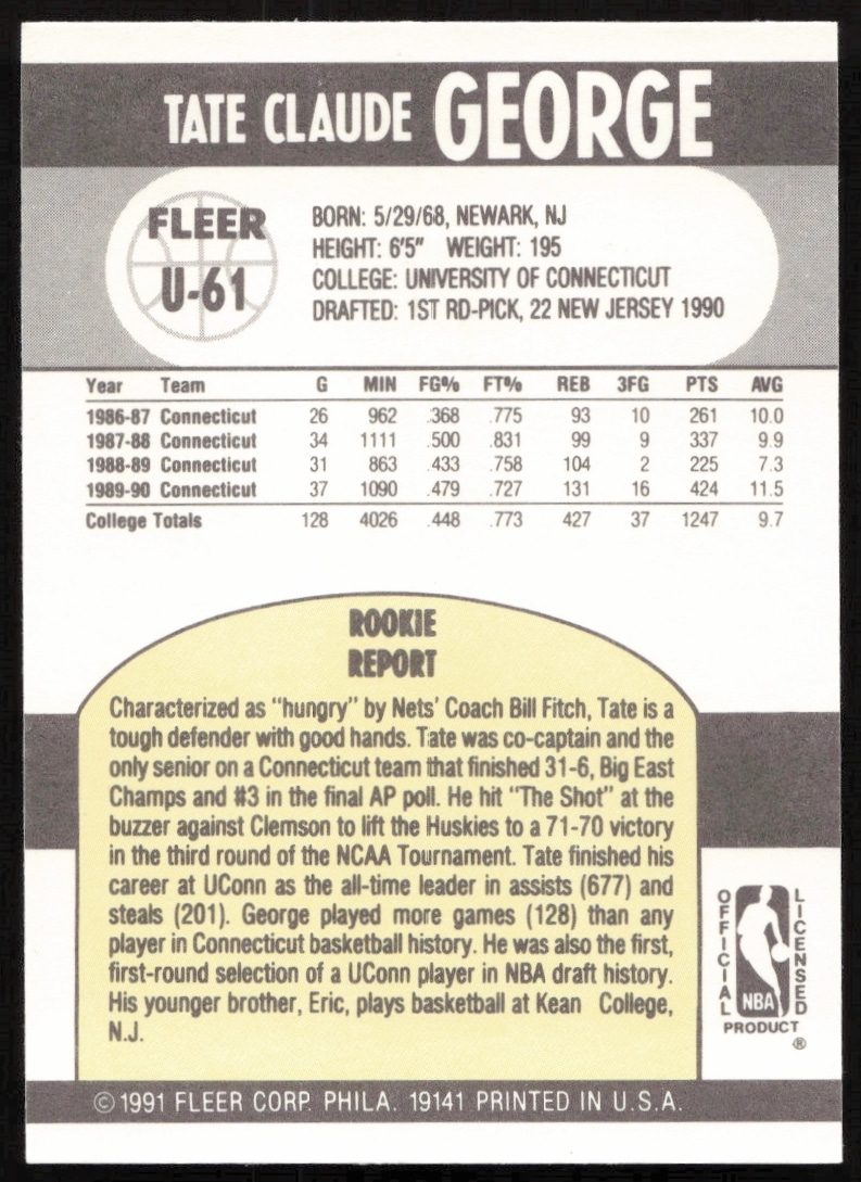 This Basketball card, from 1990-91 is part of the Fleer Update card set. Tate George is featured and has a card number of U-61.