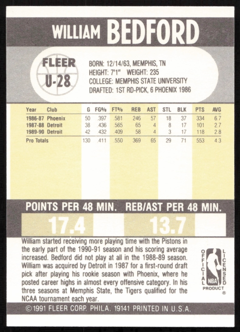 This Basketball card, from 1990-91 is part of the Fleer Update card set. William Bedford is featured and has a card number of U-28.
