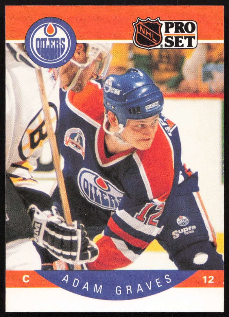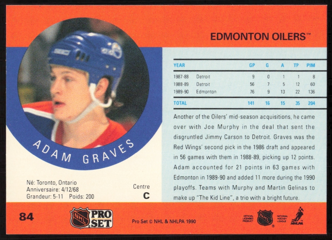 This Hockey card, from 1990-91 is part of the Pro Set card set. Adam Graves is featured and has a card number of 84.
