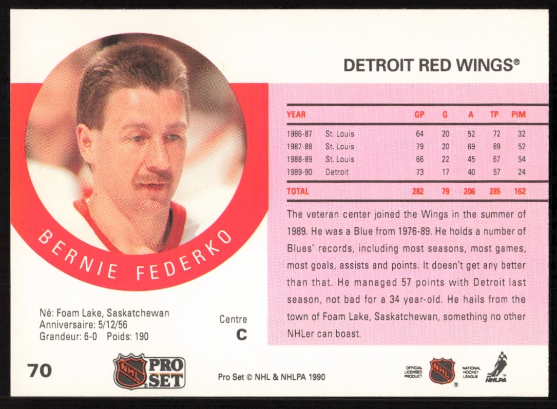 This Hockey card, from 1990-91 is part of the Pro Set card set. Bernie Federko is featured and has a card number of 70.
