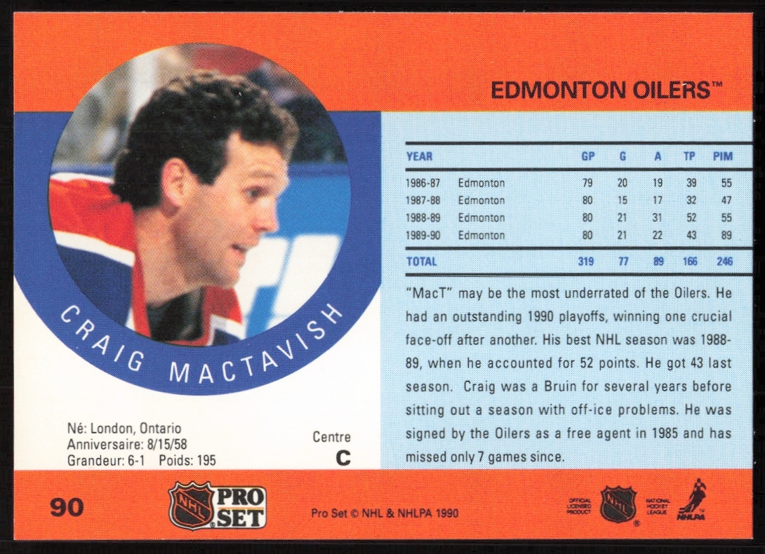This Hockey card, from 1990-91 is part of the Pro Set card set. Craig MacTavish is featured and has a card number of 90.