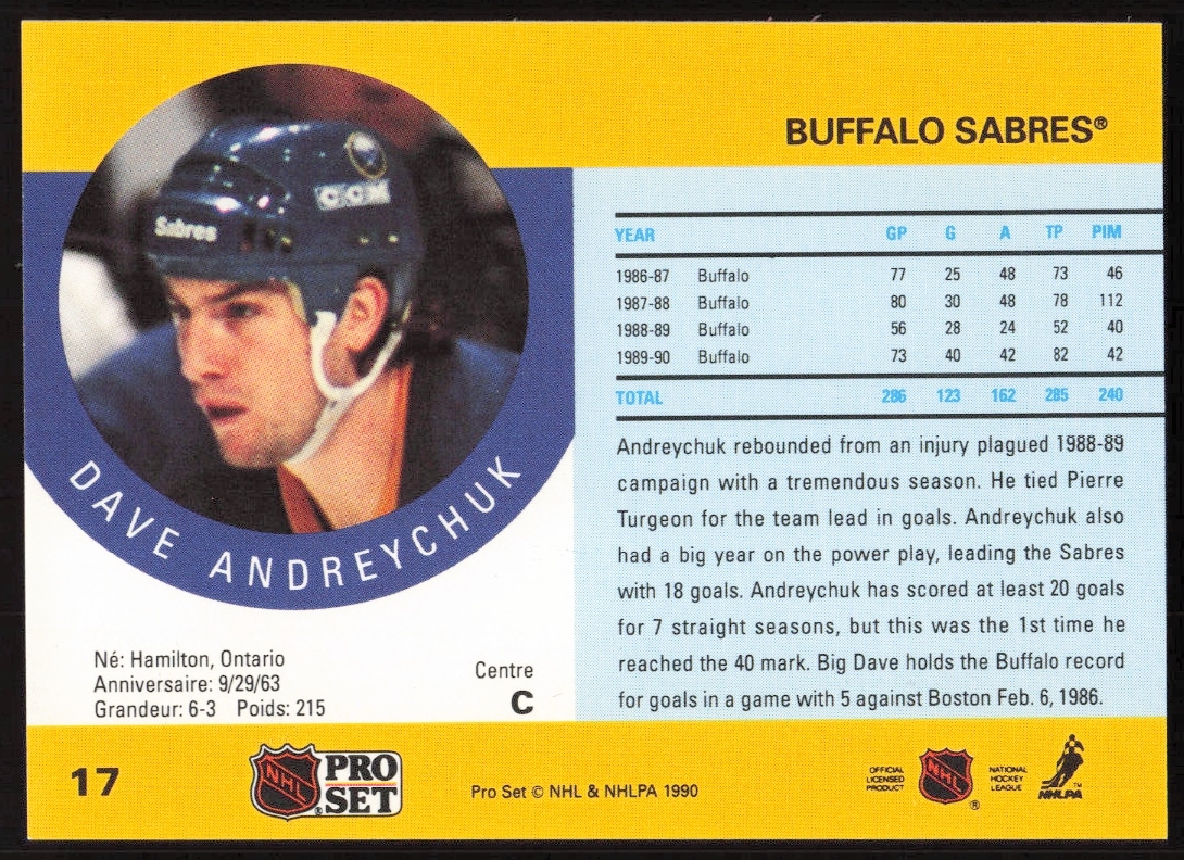 This Hockey card, from 1990-91 is part of the Pro Set card set. Dave Andreychuk is featured and has a card number of 17.