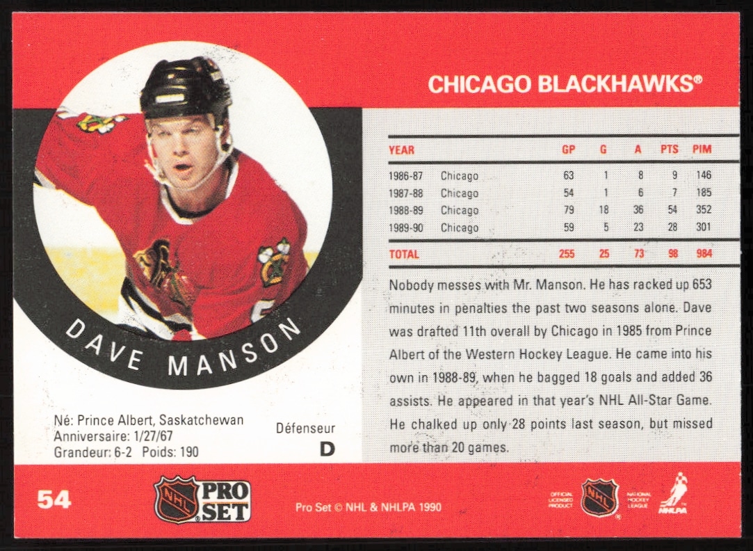 This Hockey card, from 1990-91 is part of the Pro Set card set. Dave Manson is featured and has a card number of 54.
