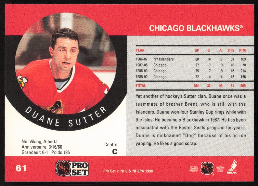 This Hockey card, from 1990-91 is part of the Pro Set card set. Duane Sutter is featured and has a card number of 61.