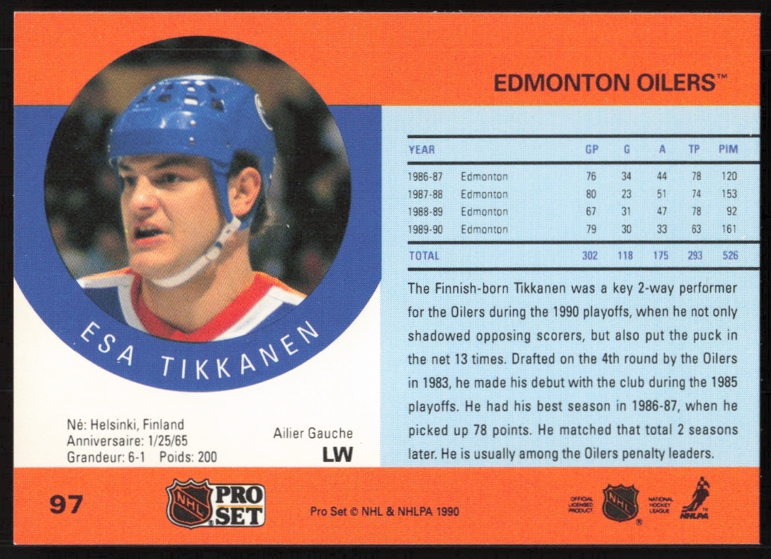 This Hockey card, from 1990-91 is part of the Pro Set card set. Esa Tikkanen is featured and has a card number of 97.