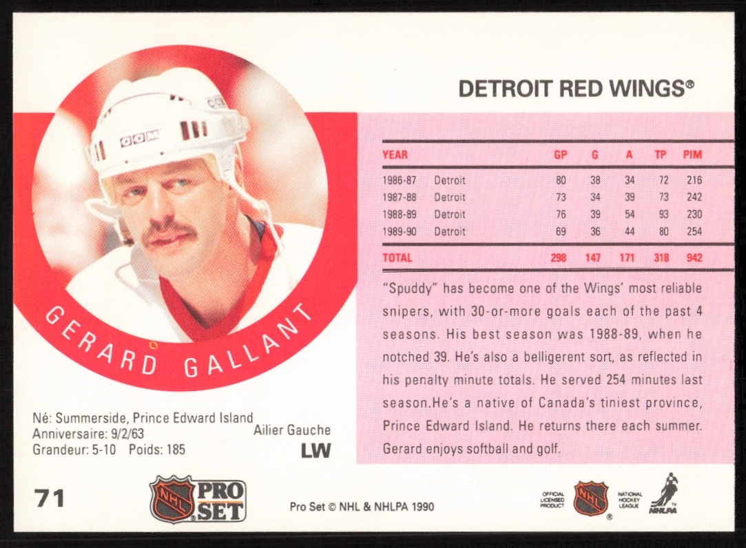 This Hockey card, from 1990-91 is part of the Pro Set card set. Gerard Gallant is featured and has a card number of 71.