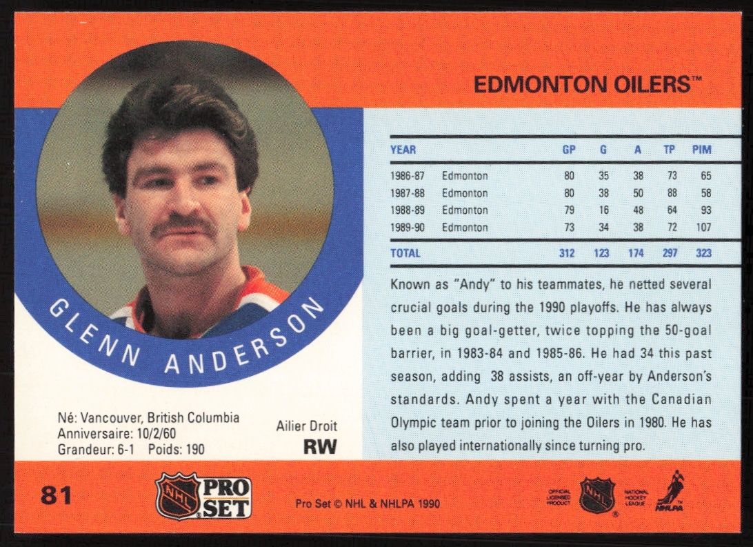 This Hockey card, from 1990-91 is part of the Pro Set card set. Glenn Anderson is featured and has a card number of 81.