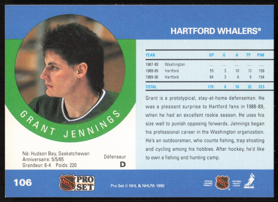 This Hockey card, from 1990-91 is part of the Pro Set card set. Grant Jennings is featured and has a card number of 106.