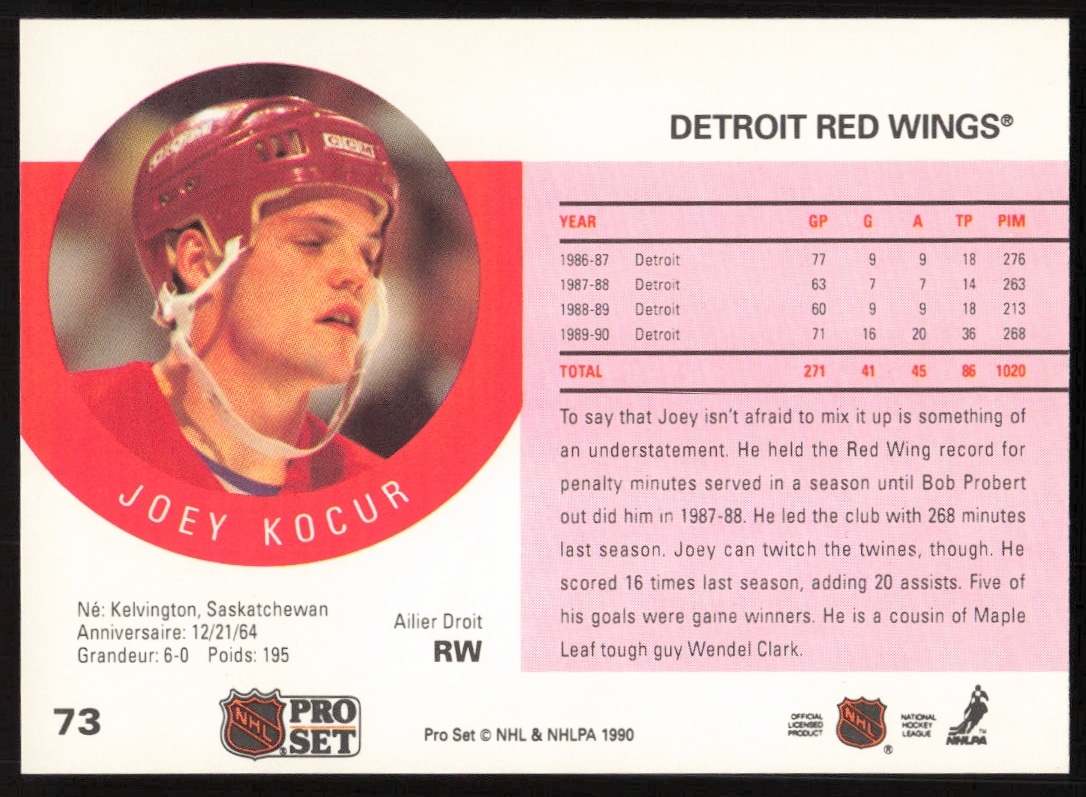 This Hockey card, from 1990-91 is part of the Pro Set card set. Joey Kocur is featured and has a card number of 73.