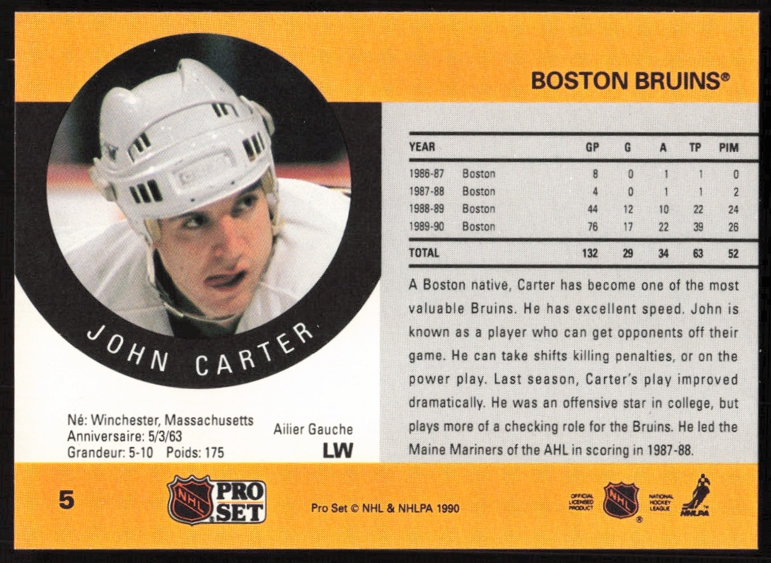 This Hockey card, from 1990-91 is part of the Pro Set card set. John Carter is featured and has a card number of 5.