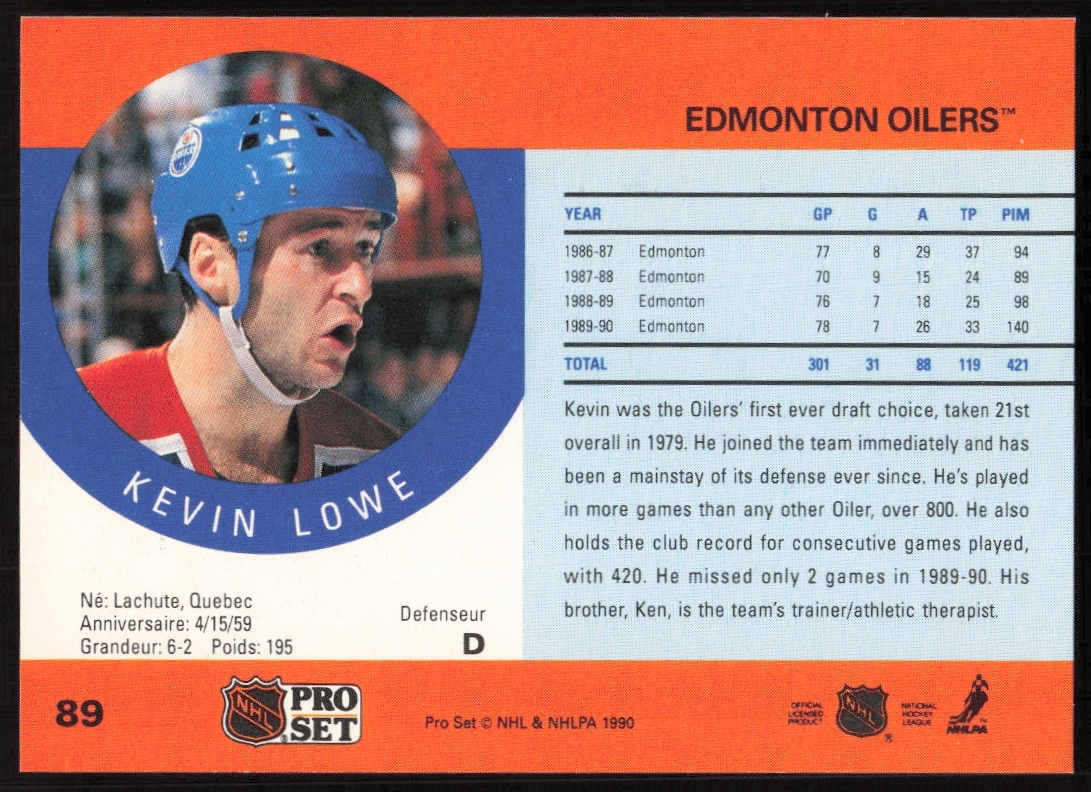 This Hockey card, from 1990-91 is part of the Pro Set card set. Kevin Lowe is featured and has a card number of 89.