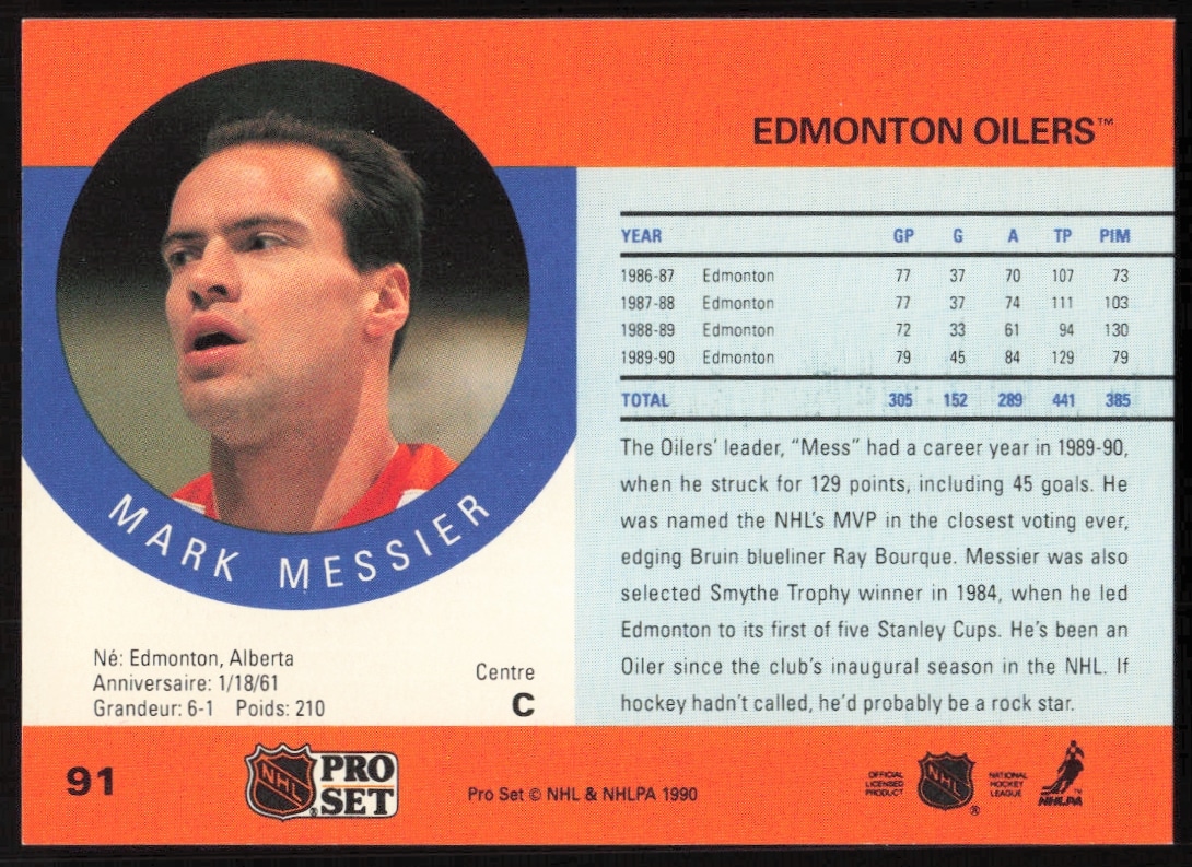 This Hockey card, from 1990-91 is part of the Pro Set card set. Mark Messier is featured and has a card number of 91.