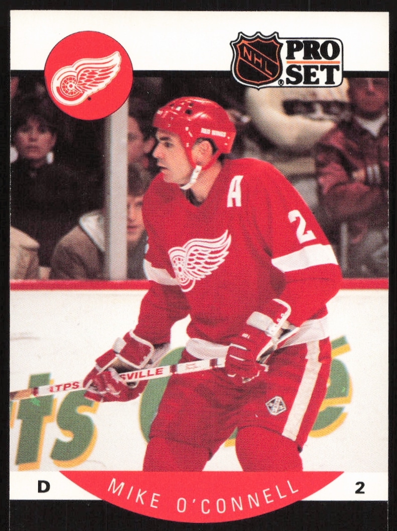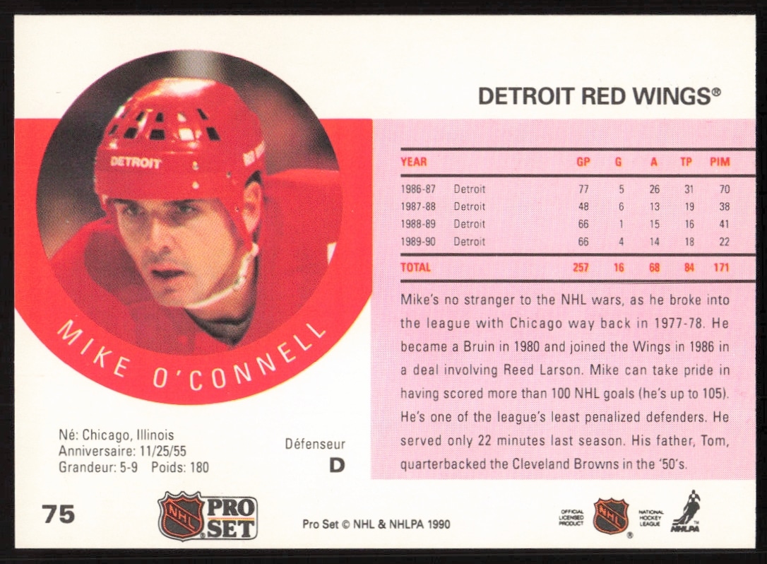 This Hockey card, from 1990-91 is part of the Pro Set card set. Mike O’Connell is featured and has a card number of 75.