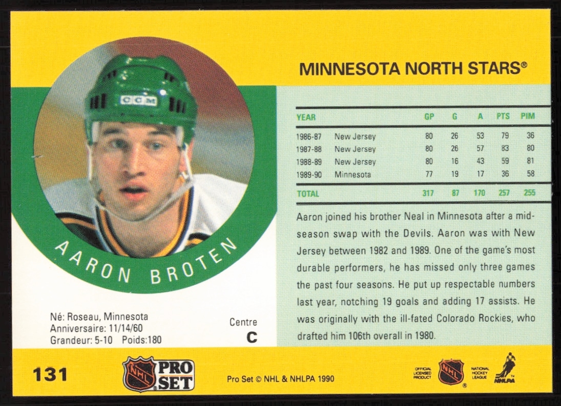 This Hockey card, from 1990-91 is part of the Pro Set NHL card set. Aaron Broten is featured and has a card number of 131.