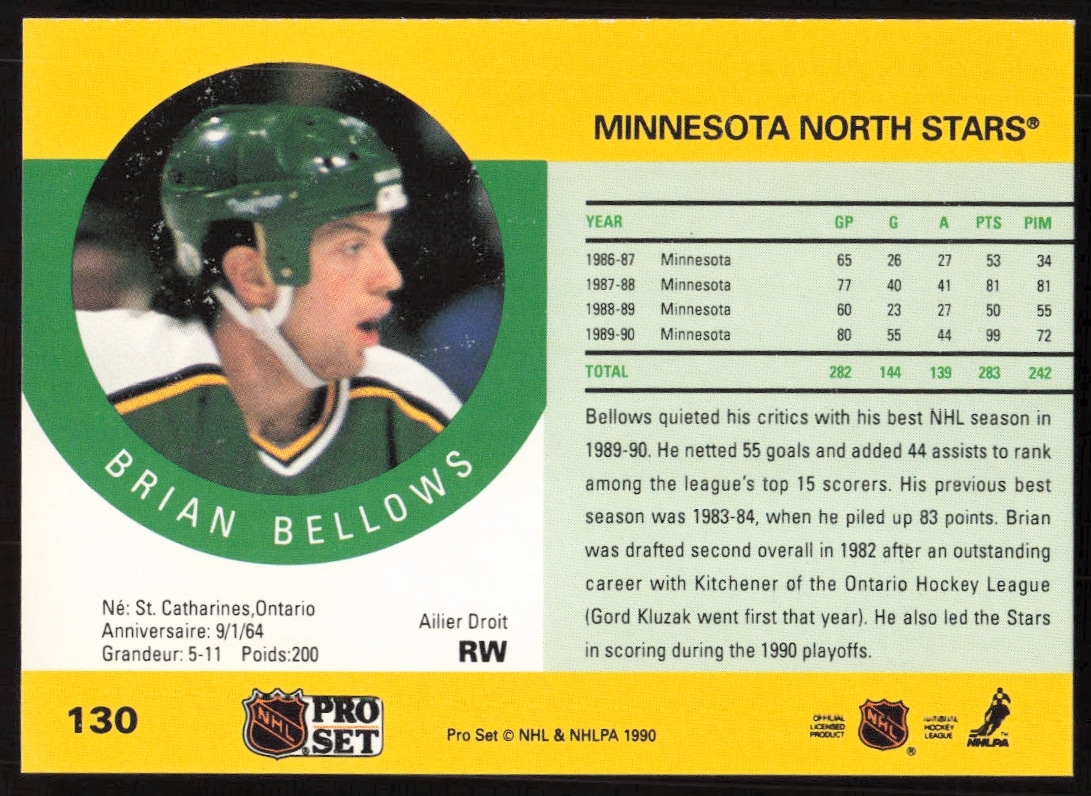 This Hockey card, from 1990-91 is part of the Pro Set NHL card set. Brian Bellows is featured and has a card number of 130.