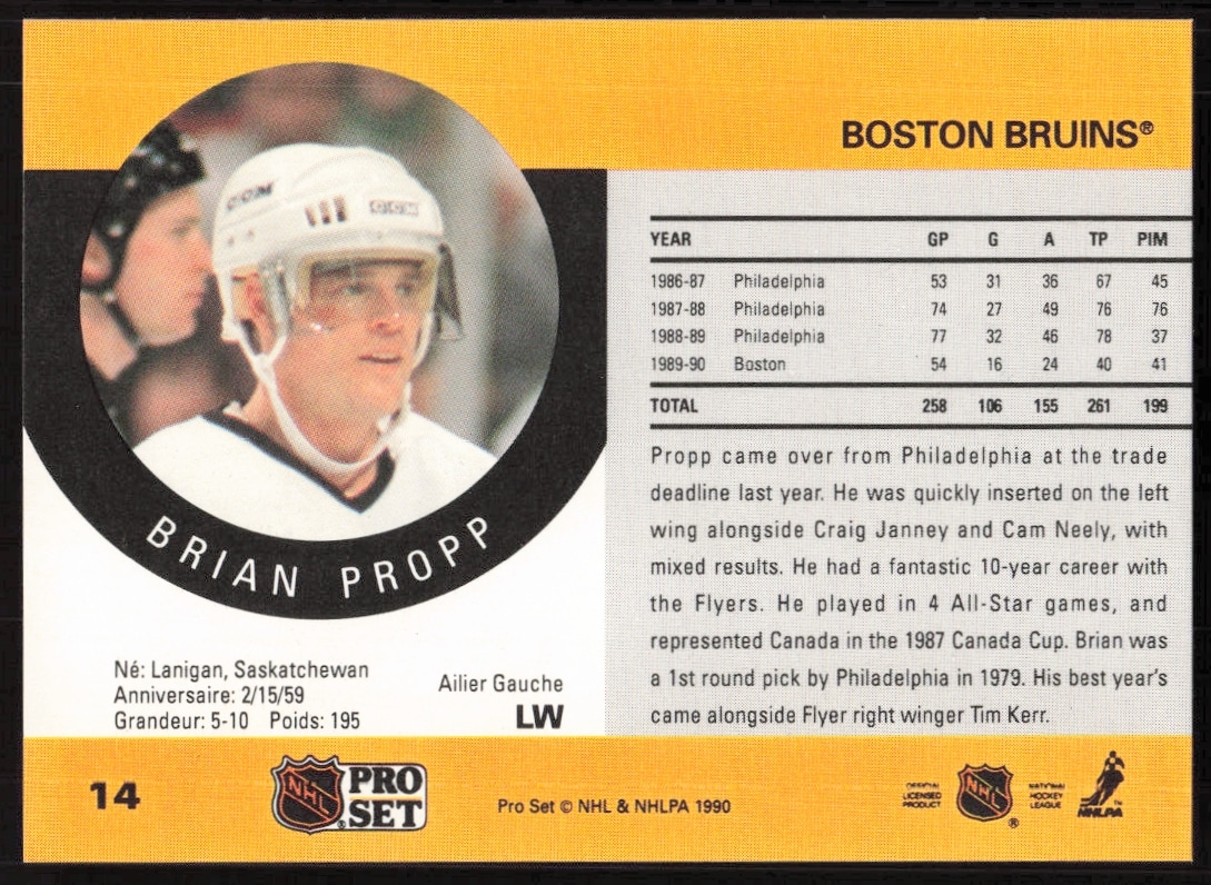 This Hockey card, from 1990-91 is part of the Pro Set NHL card set. Brian Propp is featured and has a card number of 14.