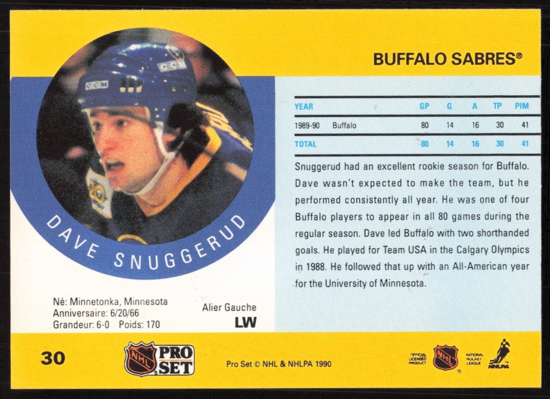 This Hockey card, from 1990-91 is part of the Pro Set NHL card set. Dave Snuggerud is featured and has a card number of 30.