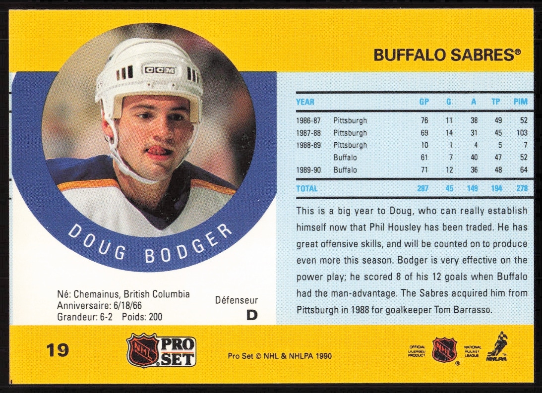 This Hockey card, from 1990-91 is part of the Pro Set NHL card set. Doug Bodger is featured and has a card number of 19.