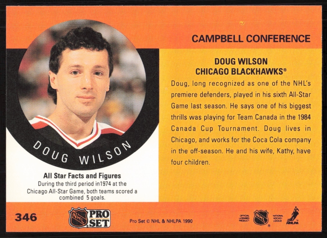 This Hockey card, from 1990-91 is part of the Pro Set NHL card set. Doug Wilson is featured and has a card number of 346.