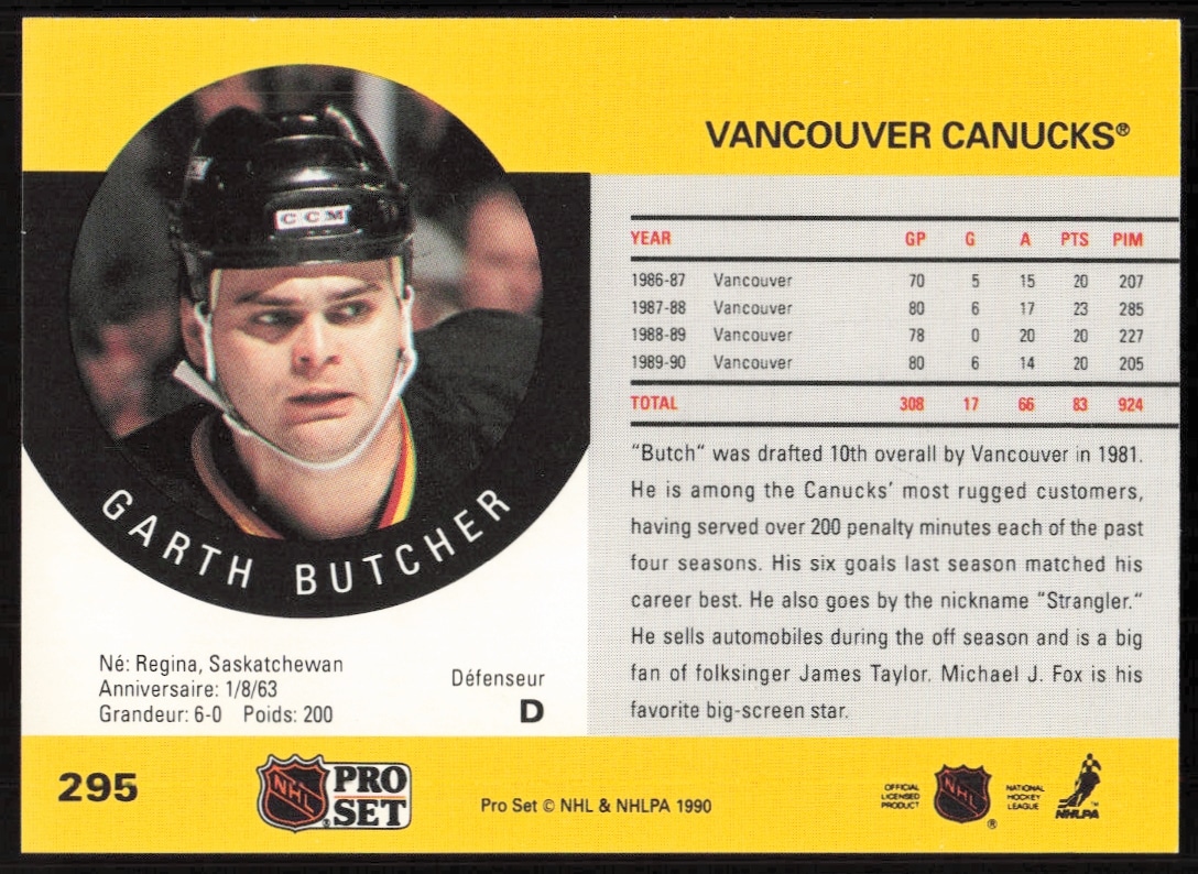 This Hockey card, from 1990-91 is part of the Pro Set NHL card set. Garth Butcher is featured and has a card number of 295.