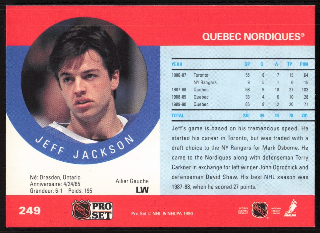 This Hockey card, from 1990-91 is part of the Pro Set NHL card set. Jeff Jackson is featured and has a card number of 249.