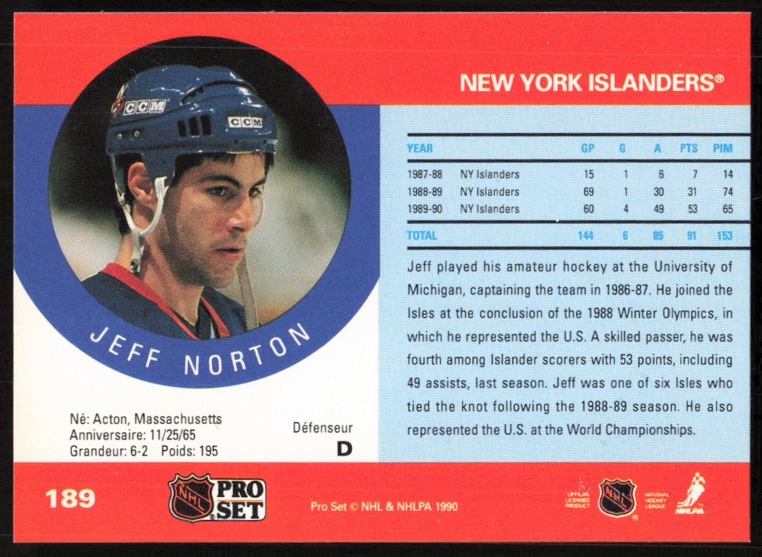 This Hockey card, from 1990-91 is part of the Pro Set NHL card set. Jeff Norton is featured and has a card number of 189.