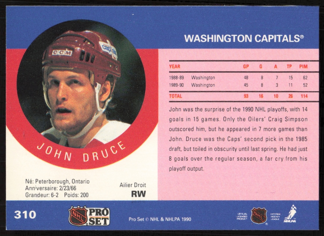 This Hockey card, from 1990-91 is part of the Pro Set NHL card set. John Druce is featured and has a card number of 310.
