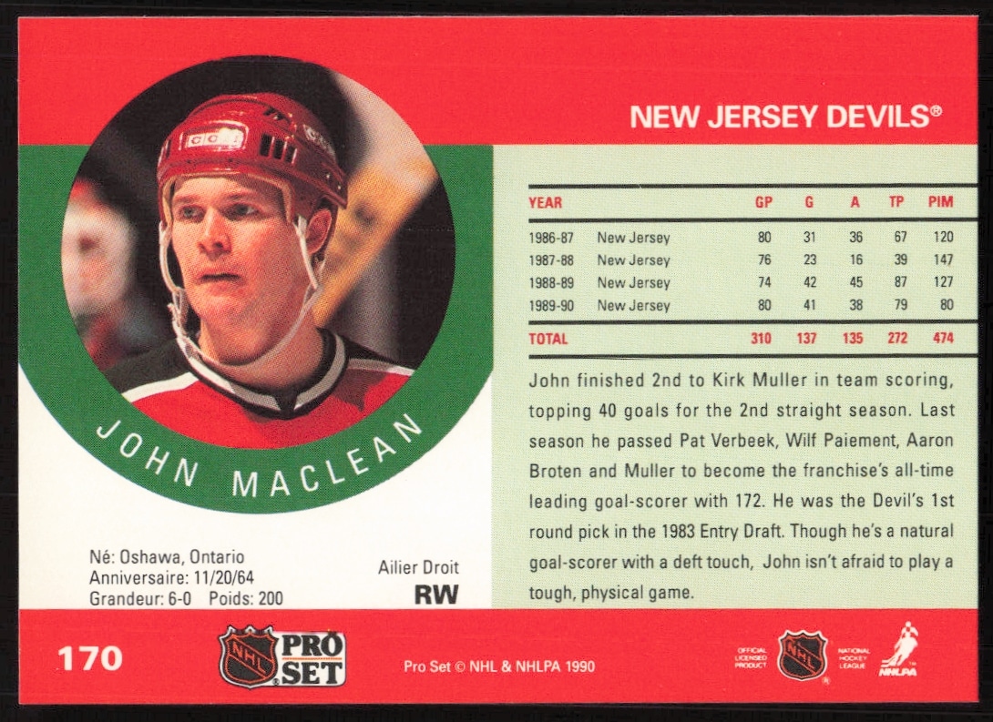 This Hockey card, from 1990-91 is part of the Pro Set NHL card set. John MacLean is featured and has a card number of 170.