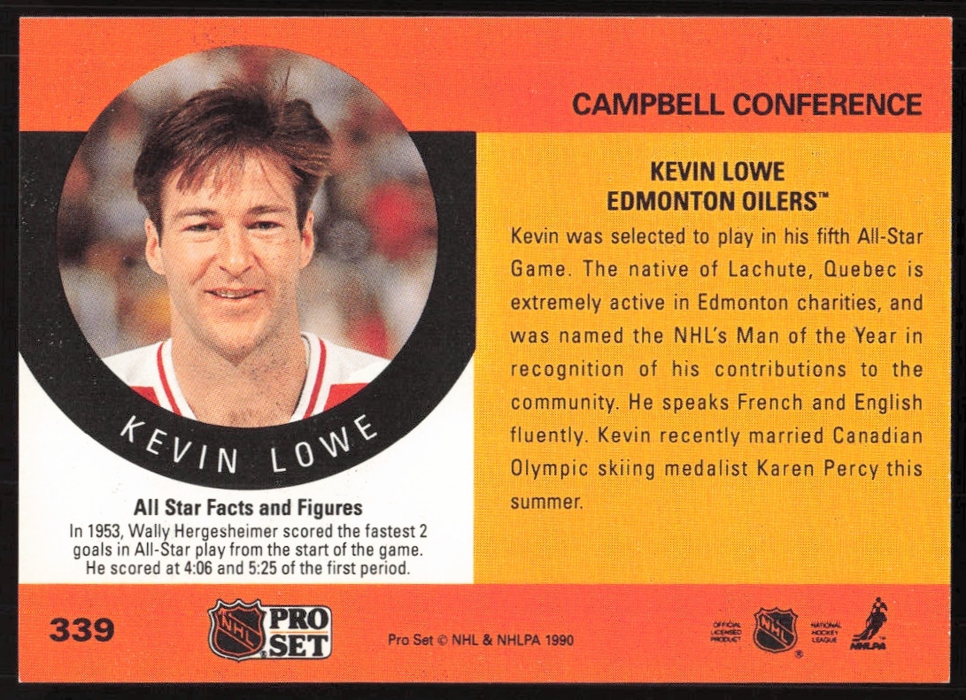 This Hockey card, from 1990-91 is part of the Pro Set NHL card set. Kevin Lowe is featured and has a card number of 339.