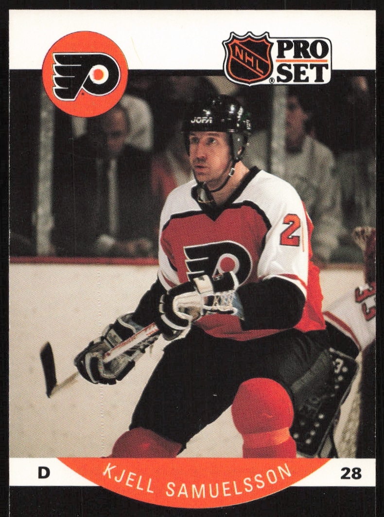 This Hockey card, from 1990-91 is part of the Pro Set NHL card set. Kjell Samuelsson is featured and has a card number of 222.
